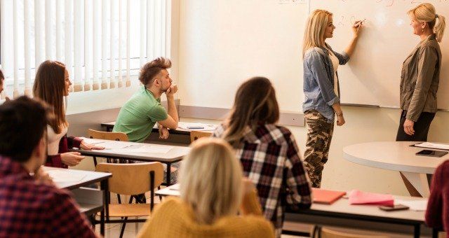 Presencial (profesor, aluno) livro, caderno e quadro.